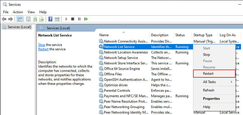 In  Services Manager, look for  Network List Service. Right-click and select  Restart to start again and hopefully, this fixes the problem.